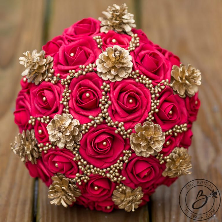 “Holiday Gold” red and gold winter themed bouquet with pine cones