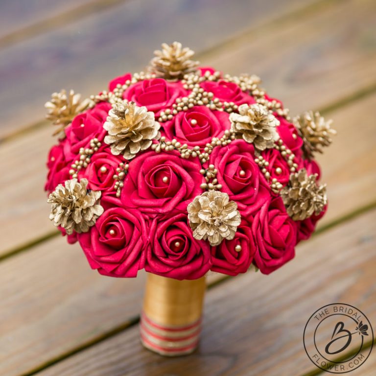 This red and gold wedding bouquet is the perfect solution to your wedding flower stress this holiday season. This bouquet will feel like it was delivered from the perfect red and gold holiday winter wonderland of your dreams! Red roses packed with beautiful gold pine cones, pearls, and berry accents give a messy but balanced look. Handle is wrapped in gold satin ribbon and accented with red ribbon strips.