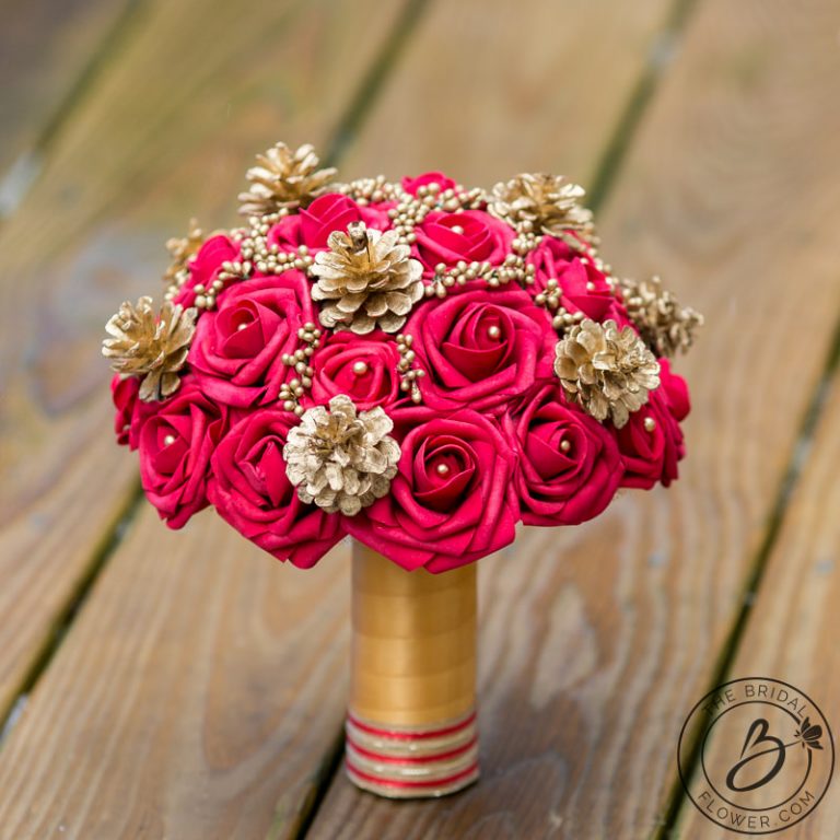 Be the first to review “Red and gold pine cones winter holiday wedding bouquet”