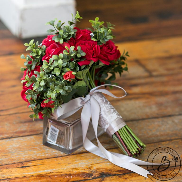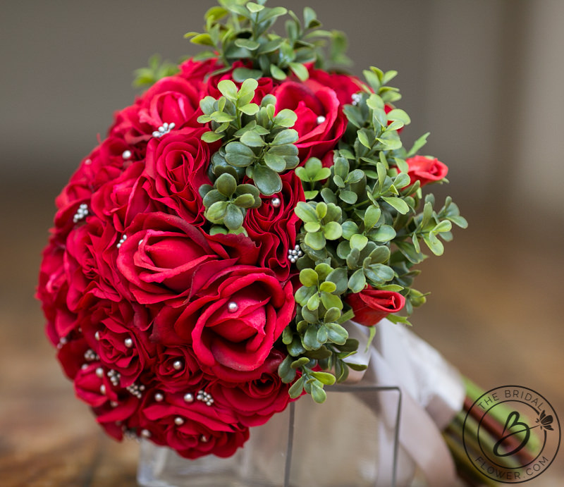 “Red Riding Hood” red real touch wedding bouquet with greenery